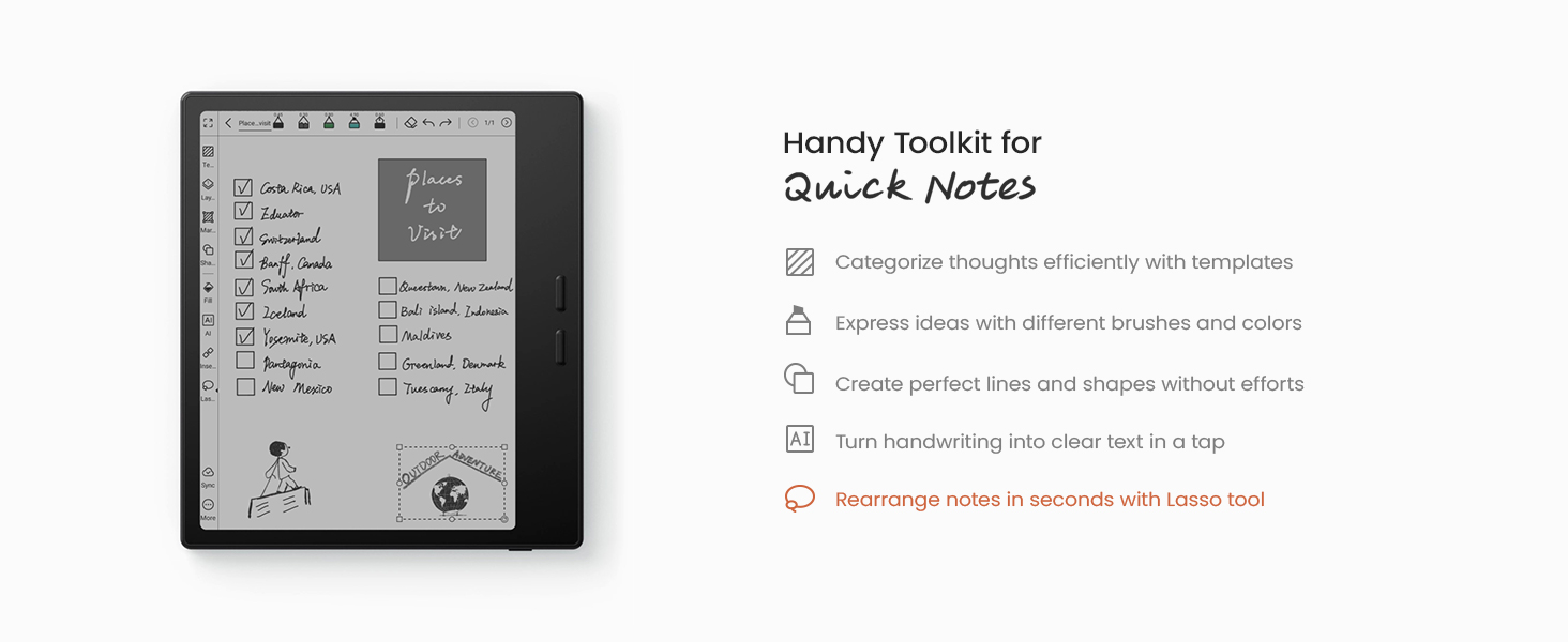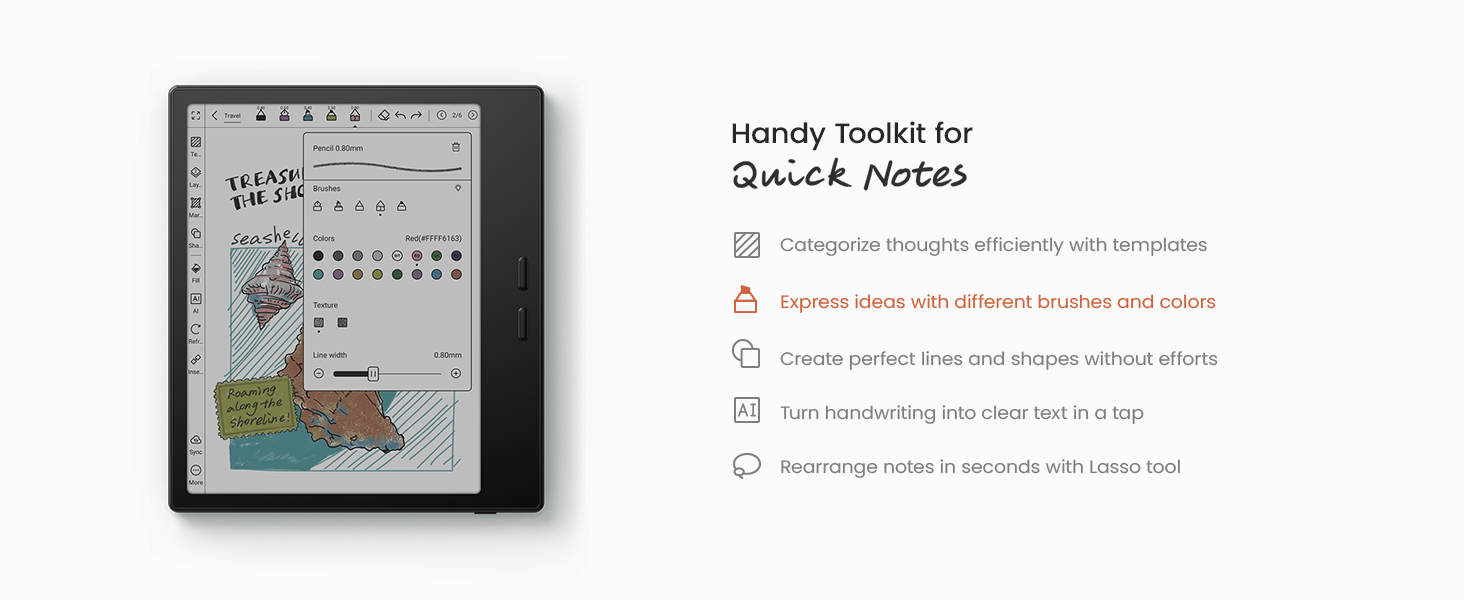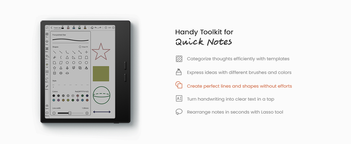 - Screen: 7" Kaleido 3 (4096 colors) Carta1200 glass screen with flat cover-lens. Resolution: 1680 x 1264 (B/W 300 ppi, Color 150 ppi). CPU: Octa-core. RAM: 4GB. OS: Android 13 ROM: 64GB Connectivity: Wi-Fi + BT 5.1