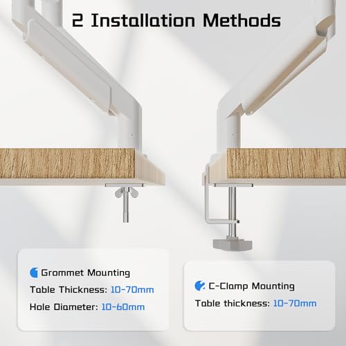 - 【Dual Installation Options】 This vesa monitor mount offers clamp style for desks 1-7 cm thick and grommet style for 1-7 cm diameter holes. Quick-release structure enables simple installation with basic screw tightening. The torsion spring prevents monitor droop while ensuring stable performance on various desk types and configurations.
