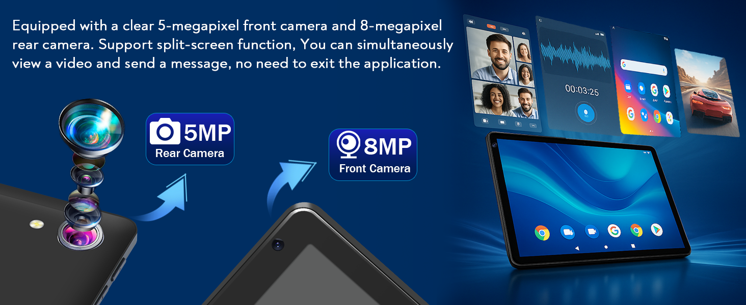 - 【10.1 Inch Tablet + 1280*800 HD + Widewine L1 】10.1 inch tablet computer has an 1280*800 IPS HD touchscreen display excellent visual experience from all angles, presenting you with richer picture display, clearer portrait capture, more delicate detail depiction, large screen soft light curtain can reduce the visual pressure on your eyes and relieve fatigue. 5MP + 8MP dual cameras are designed to meet your daily needs for great photos and clear video chats. Take photos easily anytime and anywhere. Support Widewine L1, it will be able to transmit high-definition videos of high-quality video streaming platforms.