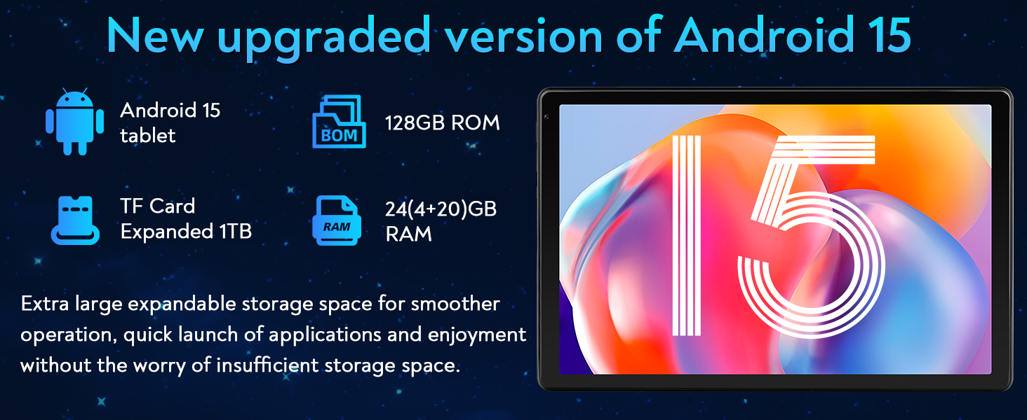 - 【Android Tablet with 14GB+64GB+1TB Expansion】This 10.1 Android 15 tablet has powerful 24GB RAM (4GB built-in+20GB expandable) and 128GB internal storage space, which can be expanded to 1TB through a microSD card, providing you with ample memory and storage space to easily handle various entertainment needs, from high-definition videos and music to e-books, online courses, and games, without worrying about capacity.
