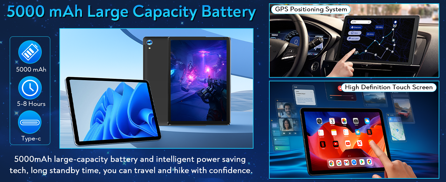 - 【5MP+8MP Dual Camera+5000mAh+Wifi 6+BT5.3】This 10 inch tablet is equipped with a 5000mAh long-lasting battery, supporting 8-hour reading, movie watching, and gaming, and is paired with a 5-megapixel+8-megapixel dual camera to meet daily shooting needs. The 800 * 1280 high-definition screen is compatible with various applications, with built-in Bluetooth 5.3 and dual band WiFi (5G/2.4G), providing strong signals. Whether at home, in the office, or in a caf é, efficient connectivity can be enjoyed, allowing for seamless work and entertainment at any time