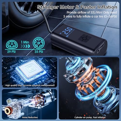 - 【2024 Stronger Motor & Faster Inflation】This small air pump for car tires embedded with a powerful 30-cylinder air pump. It provide maximum pressure of 150 PSI and airflow of 32L/Min! Only need 5 mins to fully inflate a car tire (0-36PSI) or 1 min to refill car tire in daily situation (28-35PSI). Perfect for inflating cars, motorcycles, bikes, balls, and other inflatables.