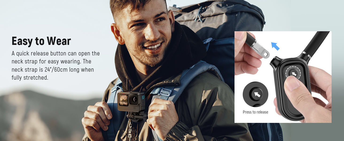 - 【Neck Mount Holder for Point of View (POV)】 NEEWER GP15 Action Camera Neck Mount can be worn like a necklace to help you capture immersive POV shots right in front of your chest. It features a quick release button (upper left arrow) that can release the neck strap for effortless wearing. The neck strap is 24" (60cm) long when fully stretched