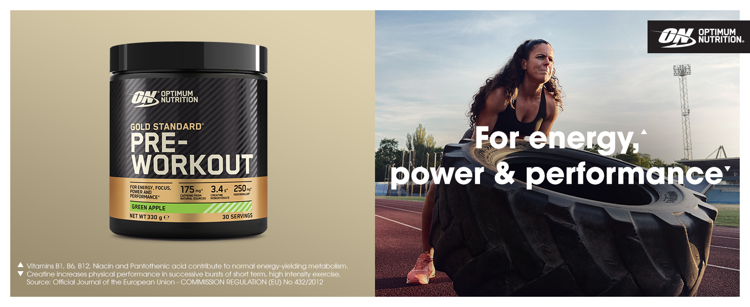 Discover Optimum Nutrition Gold Standard Pre Workout Powder. This ready-to-mix energy drink is designed to improve your focus, power, and performance* before and during your workout. ON Gold Standard food supplement is Informed Choice Certified and contains a carefully-selected list of ingredients. It’s packed with 175 mg of caffeine from natural sources to help increase alertness and focus before training*. Each serving provides 3.4 g of creatine monohydrate that helps support your power,and performance,. This great-tasting sports drink also contains Vitamins B 1, B 3, B 5, B 6, and B 12, which all contribute to normal energy-yielding metabolism**. On top of that, it also includes Beta-Alanine (Carnosyn), Citrulline, L-Carnitine, and N-Acetyl-Tyrosine. A variety of flavours – Fruit Punch, Green Apple, Watermelon, Blue Raspberry, and Kiwi – means that you don’t need to sacrifice flavour for your energy, focus, and performance gains. The pre-workout supplement is designed for everyone: from those just starting on their path to leading a healthier lifestyle to athletes, hard-working students, professionals, and fitness lovers. Optimum Nutrition Gold Standard Pre Workout Powder is a tasty pick-me-up that doesn’t break the bank and can be enjoyed at any time and anywhere; at home, on the go, or at the gym. To prepare a tasty shake, add 1 level scoop to 350 ml of cold water, mix, and serve. *Source: EFSA Journal 2011;9(4):2054 24 **Source: COMMISSION REGULATION (EU) No 432/2012
