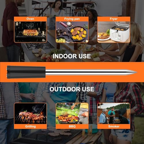 - 【Intelligent Cooking System】The wireless thermometer comes with ten built-in recipes, such as: B. for beef, veal, lamb and chicken. Compatible with any iOS/Android device, it has a built-in timer and cooking alarm to help you avoid undercooking or overcooking your food while allowing you to customize the cooking time and temperature.