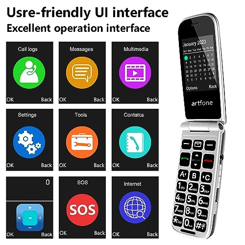 - 【Perfect gift for seniors in different languages】 The artfone 4G flip phone is a perfect gift for seniors, parents or children. It is easy to use and offers many useful features. It is also available in different languages: English, German, Spanish, French and Italian. The phone comes with a charging dock, a USB-C cable, a user manual and UK- plug. Order now the artfone 4G flip phone and make your loved ones happy!
