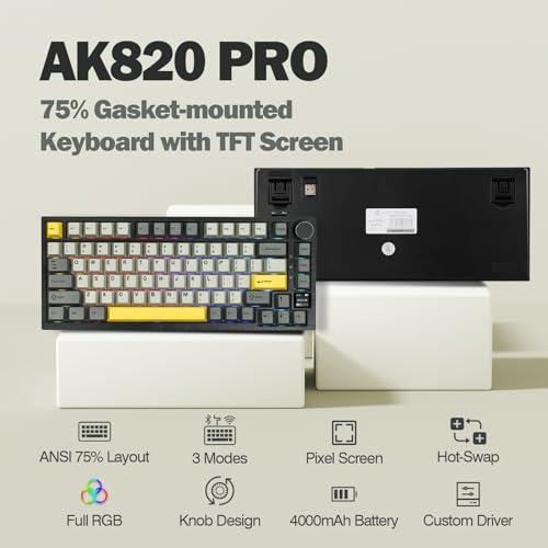 - 【TFT Screen: The Interactive Interface】This 75% mechanical keyboard comes equipped with a TFT Screen, serving as your interactive interface for real-time updates and customization. The high-definition display allows for customizable visuals, battery status, date & time display, connectivity & OS display, and backlight effects. With this TFT Screen feature breakdown, it’s easily to understand the full range of its capabilities and why the Ajazz AK820 Pro stands out from other keyboards on the market.
