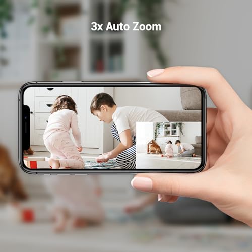 - Auto Motion Tracking with 4x Zoom: The camera can automatically zoom in up to 4 times to follow a moving person so you see details and get the whole picture at the same time. You can always enable the AI option to detect and track specifically human movements.