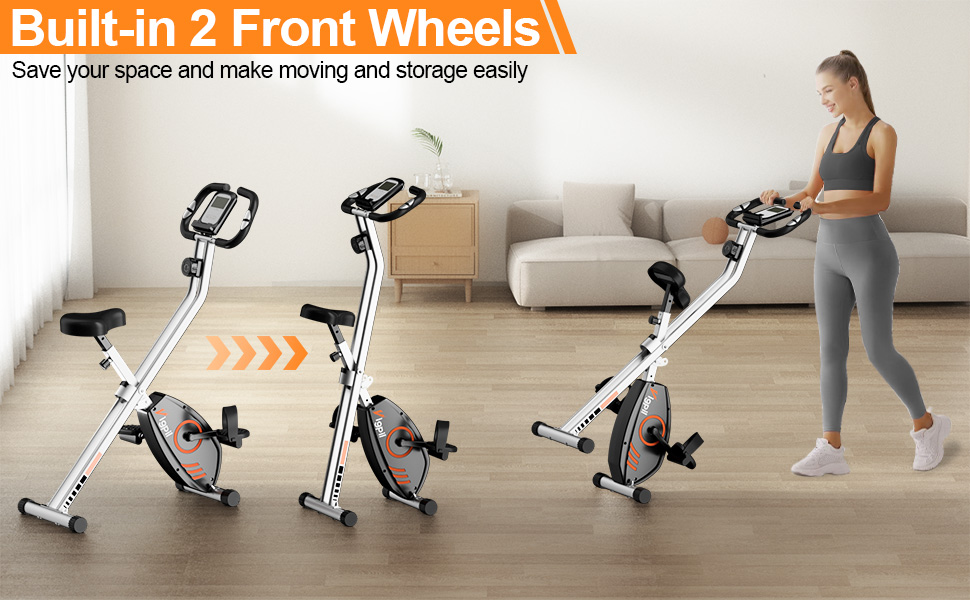 - 【Compact & Foldable Exercise Bike】The compact and folding design of the exercise bike help you save space and move it easily. It comes with built-in transport wheels for effortless maneuverability. You can conveniently stored it when not in use.