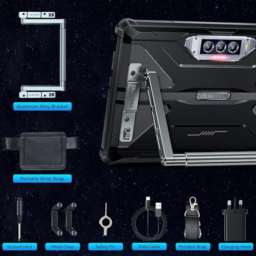 - 【IP68&IP69K Tablet & Multi-functional Aluminum Alloy Stand】The OUKITEL RT7 rugged tablet meets MIL-STD-810H military standards and has been certified for IP68 waterproofing and IP69K dust resistance & high-temperature tests. It is highly suitable for warehouse and logistics personnel, outdoor enthusiasts, and construction workers,etc.The RT7 tablet also comes with an aluminum alloy stand, screwdriver, wrist strap, and shoulder strap, making it easy to carry and install in various settings.