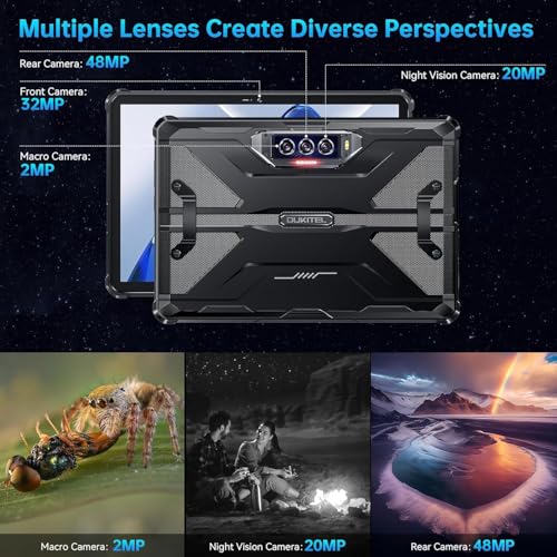 - 【48MP Main + 32MP Front + 20MP Night Vision Camera】The OUKITEL RT7 5G tablet boasts a 48MP main camera, a 32MP front-facing camera, and a 2MP macro camera with AI triple-camera capabilities. The RT7 tablet also supports barcode scanning and QR code scanning, making it an ideal choice for logistics and warehouse personnel to quickly and accurately scan packages.Furthermore, it supports a 20MP IR infrared night vision camera, ensuring clear image capture even in pitch-black environments.