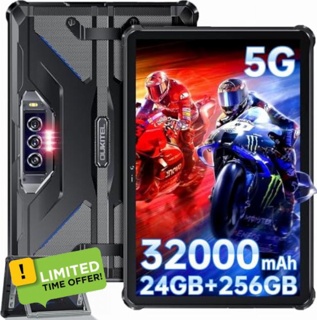 - 【24GB RAM+256GB ROM & Android 13】 The OUKITEL RT7 5g rugged tablet is powered by the Android 13 operating system, allowing for smooth multitasking with multiple apps and large games running simultaneously without any lag. Additionally, this rugged 5G tablet comes with 24GB (12GB+12GB Virtual) of RAM and 256GB of ROM (expandable up to 1TB with a TF card), providing ample space for storing documents, videos, and applications.