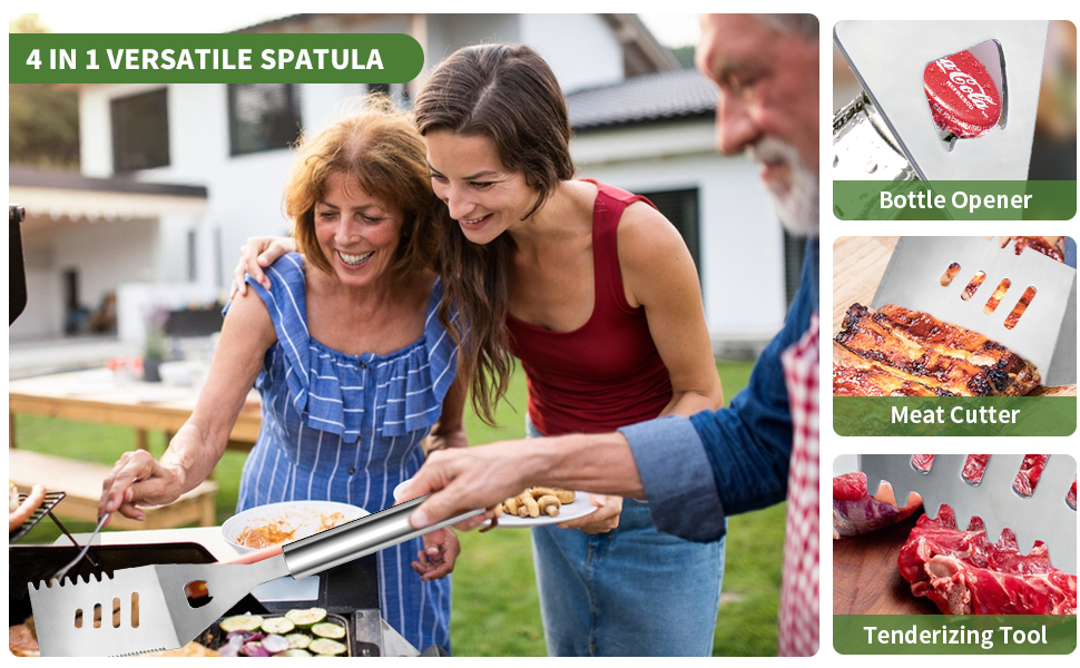 - 【Practical & Multifunctional】This BBQ accessorie is covering the entire cooking and cleaning process. The power tongs can flip food and open bottles; the barbecue spatula and fork are suitable for different needs, allowing you to flip and cut; the meat thermometer ensures a perfect taste; the barbecue skewers and corn holders are convenient for grilling various ingredients. Suitable for outdoor and kitchen use, it provides convenience and efficient grilling experience.