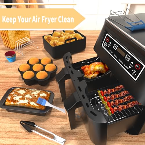 - 【Complete Air Fryer Accessories Set】Each Set Includes 2 Square Silicone Liners, 1 Ninja air fryer rack, 1 Skewer Rack with 4 Skewers, 1 Seven-hole silicone egg mould, 1 Nonstick Loaf Pan, 1 Toast rack, 1 Anti-scalding Bowl Clip, 1 Food Clip, 1 Oil Brush, and 6 Muffin Cups.
