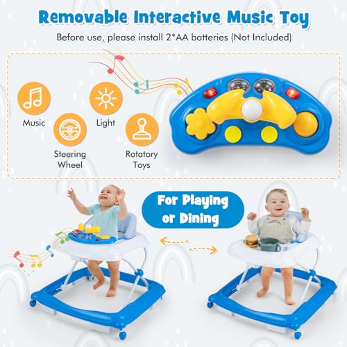 - 【Interactive Music Toy Station】The baby walker with wheels comes with removable music toy which can stimulate kid's sensory development. Apart from playing melodies, this walkers for babies also features light, steering wheel, rotatory toys for added fun. Before use, please install 2*AA batteries (Not Included). Remove the music toy and immediately turn it into a tray for playing or dining.