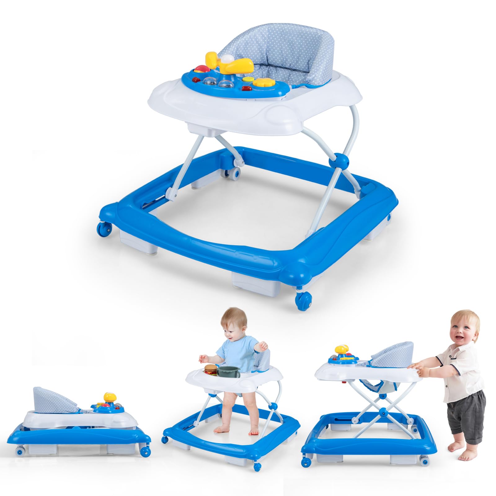 COSTWAY 5 in 1 Baby Walker, Foldable Push Along Walkers with Adjustable Height, Removable Cushion, Music & Lights, Toddler First Steps Early Development Toy for Babies 7-14 Months (Blue)