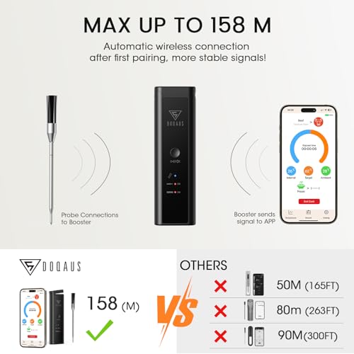 - 158M Wiresless Range: Featuring an intelligent wireless designed, which are Bluetooth 5.0 technology, this DOQAUS wireless meat thermometer can monitor food temperature up to 150m range away through a user-friendly phone app. Providing enhanced mobility during the cooking process. Compatible with iOS and Android devices