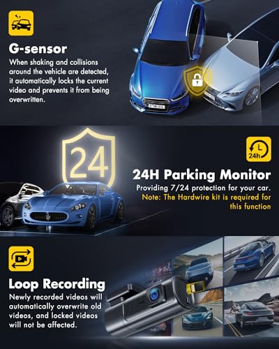 - 24 HOUR PARKING MODE — In the parked state, the 24h parking mode can record potential abnormal events such as collisions, theft, scratches, etc. This provides crucial evidence for vehicle owners, greatly assisting in dispute resolution and instilling a sense of security. It helps vehicle owners better manage and protect their vehicles.hardwired needed. Due to varying car models, we can't offer a universal cable. Contact after-sales for help choosing the right hardwired for your vehicle.