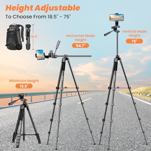 - 【75'' Lightweight Travel Tripod】The tripod for smartphone has 4 adjustable quick flip lock knobs for fast extension from 18.5 to 75 inches. It folds up to 18.5 inches and weighs only 1kg, so it can fit in your luggage or the included storage bag. Sturdy, lightweight, and easy to carry, this aluminum lightweight tripod will be your perfect travel companion.