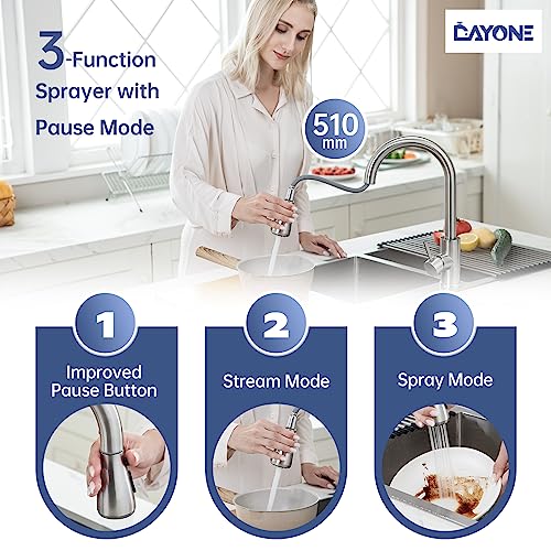 - 3-Function Sprayhead DAYONE kitchen sink tap offers aerated stream for everyday cleaning and powerful spray for heavy-duty rinsing. The pause button control the steam out/stop as you need. Ideal for multiple kitchen cleanup need.