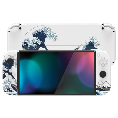 eXtremeRate Full Set Shell for Nintendo Switch OLED, Console Back Plate & Kickstand, NS Joycon Handheld Housing with Buttons for Nintendo Switch OLED (The Great Wave Off Kanagawa)