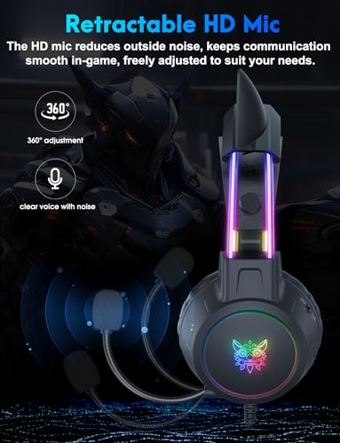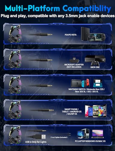 ONITOON Lightweight Gaming Headset,Removable Cat Ears, Gradient RGB Light, Wired Headphoe for PC/Mac/PS4/PS5/Xbox One/Switch/Phone, Virtual Surround Sound, Noise Cancelling Mic