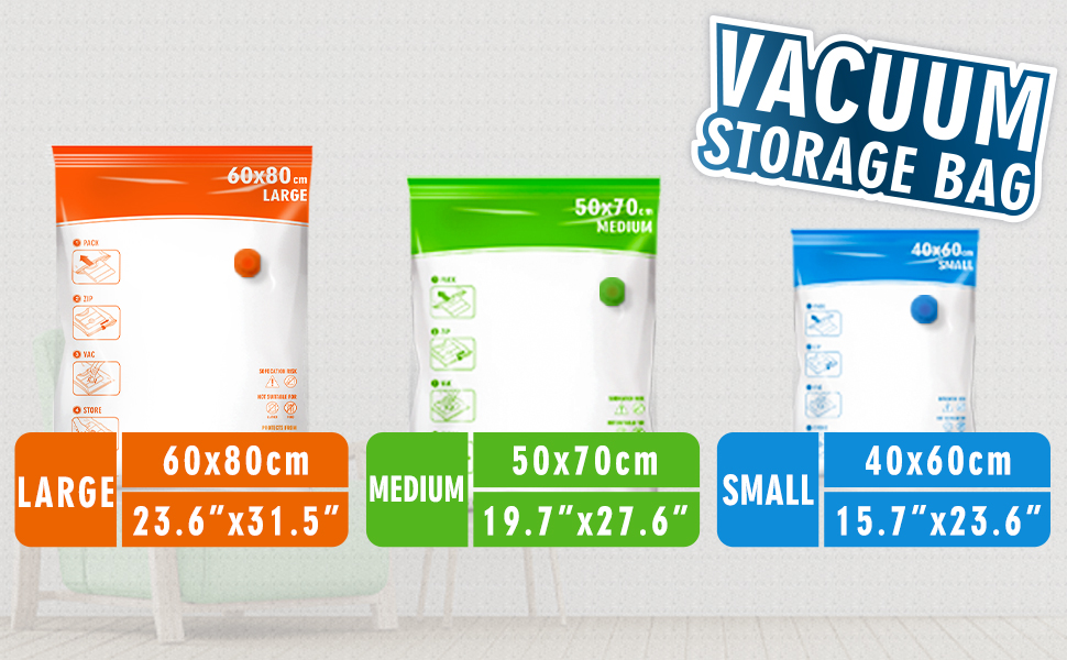 - 20 x MIXED SIZE BAGS (5 SMALL, 5 MEDIUM, 5 LARGE, 5 Jumbo) Vacuum Storage Bags offer a perfect solution for storage, with which you can put away your seasonal clothes, comforters and blankets, pillows and more. Easily create 80% more space!