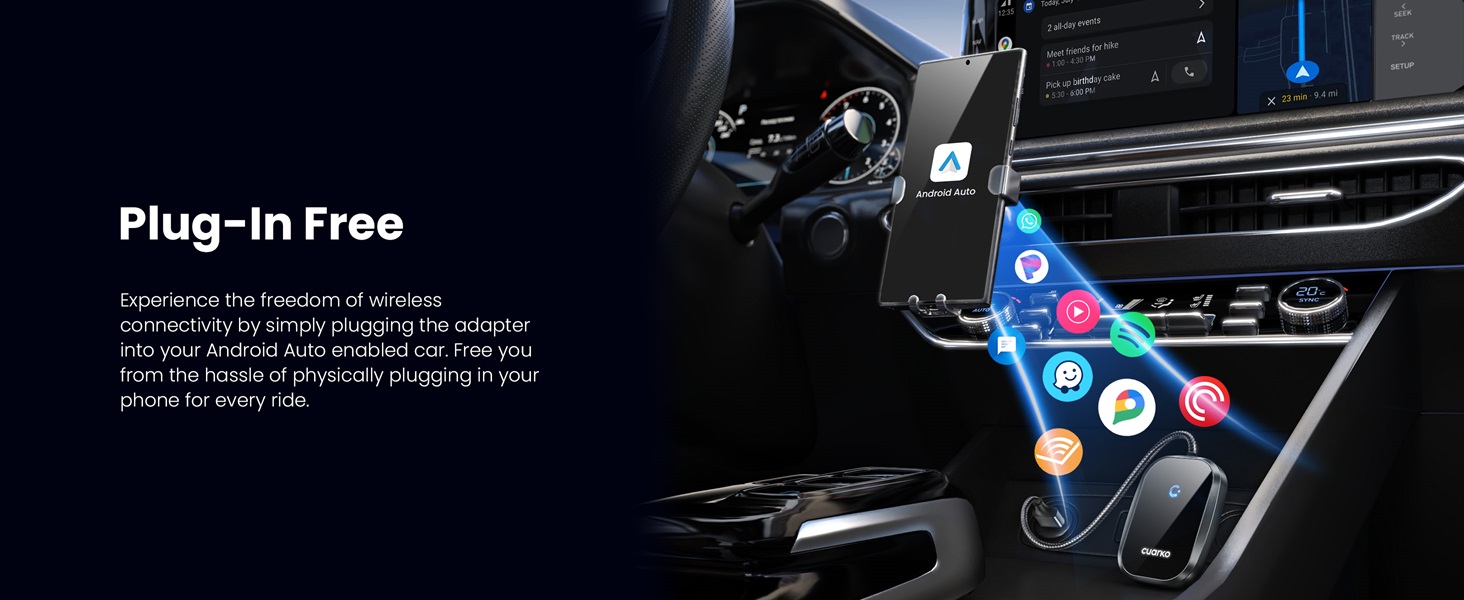 - [Upgrade Your Car's Navigation System to Wireless] Say goodbye to tangled wires and distractions while driving. Our cuarko wireless Android Auto adapter seamlessly converts your wired system to wireless, providing a safer and more streamlined experience. With wireless connectivity, access your phone apps on your vehicle screen hassle-free. Enjoy GPS mapping, music playback, messaging, and calls wirelessly while preserving your car's original operations. (Requires Android OS 12 or above.)