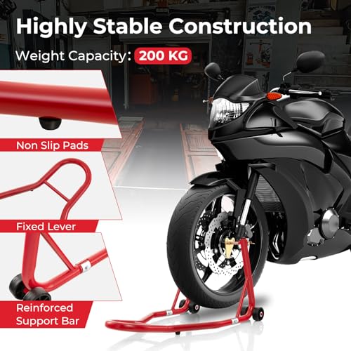 - 【Highly Stable Construction】 Our front wheel motorcycle stand boasts a highly stable construction, providing you with the load capacity of 200 kg. Meanwhile, the strengthening fixation works together with reinforced support bar and fixed lever to further enhance the stability of your monocycle.