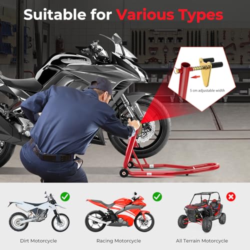 - 【Suitable for Various Types】 Designed with a front fork adjustable width from 20cm to 30cm, this portable paddock stand allows for easy customization, accommodating various sizes of motorcycles. Whether you own a dirt motorcycle, a racing motorcycle, this power stand is suitable for all your needs. Note: all terrain motorcycle is not suitable for our stand.