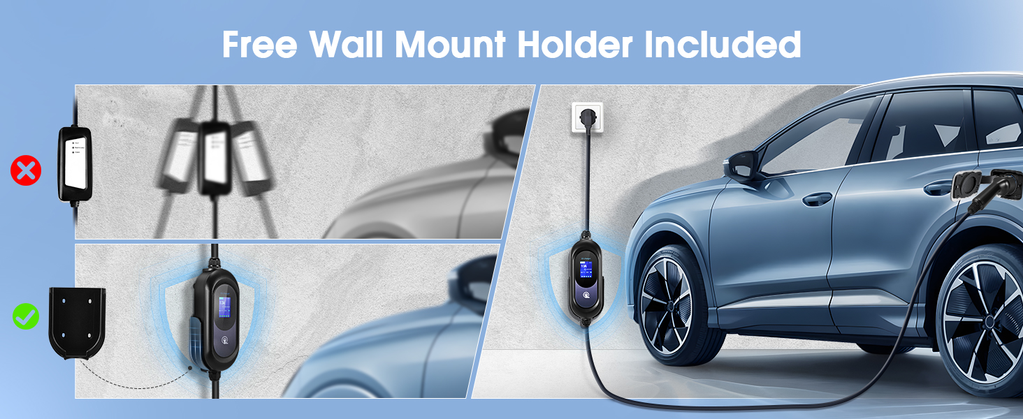 - CHARGING AT HOME OR OUTSIDE – Comes with a free wall mount bracket, which can securely fix this 3 pin EV charger on the wall to prevent it from shaking and damaging household sockets. The accompanying cable bag makes it convenient for you to carry it while travelling. Optional cable lengths of 6/8/10/15 meters meet your parking needs in different locations.
