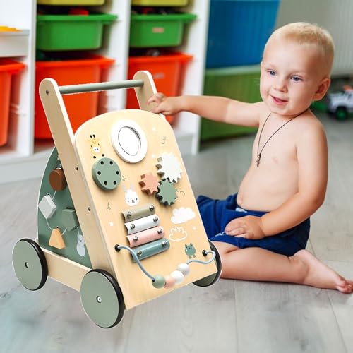 - Multi functional Fun Walking Car: The push-pull walking aid is equipped with a type rotation pairing, track positioning, plucking and circling beads, melodic piano playing, rotating gears, clear mirror, etc., allowing babies to have endless entertainment. Various activities that stimulate the baby's senses.