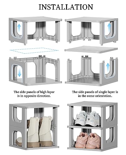 - UPGRADED REMOVABLE PARTITION PANEL – The upgraded shoe rack well fits most of shoes type, which can be freely assembled to change the height. Each 2 shoe cubes can be installed into a high module to place your boots and high heels. The height of a single layer is 14.3cm, the higher layer 27.8cm. Not only can you storage flats, slippers, but also can remove the one layers to store sneakers, high heels, or other larger accessories to suit different scenarios.