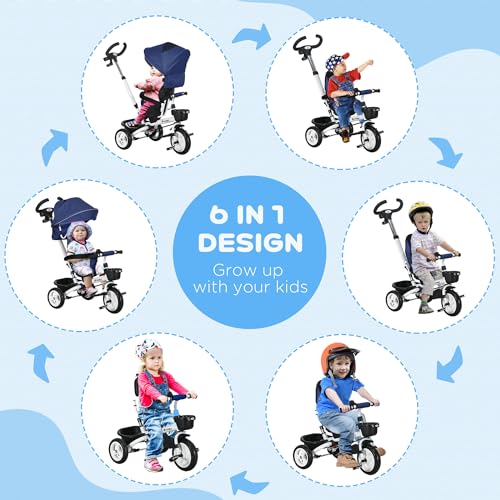HOMCOM 6 in 1 Trike for Toddler, Baby Push Tricycle Folding Bike with Parent Handle, Reversible Seat, Storage Basket, Canopy, 5-point Safety Harness, for Kids 1-5 Years, Dark Blue