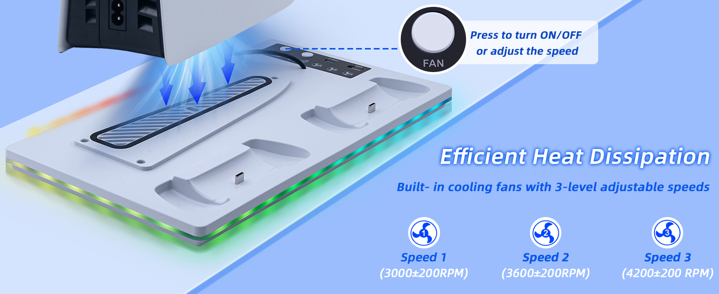 - Adjustable Cooling Fan for PS5/PS5 Slim: Equipped with a built-in turbo fan featuring 3 adjustable gears (3000±200, 3600±200, 4200±200 RPM), our stand provides efficient heat dissipation. This ensures your console remains cool, even during marathon gaming sessions, prolonging the life of your system.