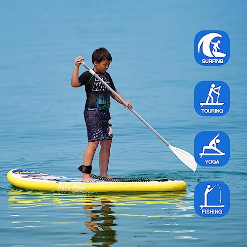 - [Complete Paddle Board Kit]- Our isup provides everything you need: inflatable paddle board, foot rope, fin x1, single head paddle, waterproof bag, pump, easy kayak seat, backpack, shoulder straps, you don't have to choose additional accessories for kids and families to reduce the stress of travelling more easily