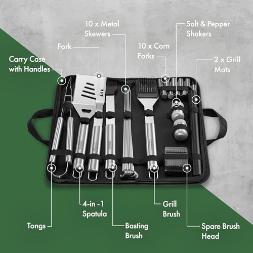 VonHaus BBQ Tool Set with Case, 30Pcs BBQ Accessories Kit Including Spatula, Fork, Tongs, Skewers, Corn Forks, Barbecue Grill Mats, Basting Brush & Cleaner, Heavy Duty BBQ Utensils for Outdoor Cooking