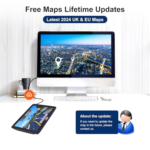 - 【Free Map Updates/Downloads】 This satnav comes pre-installed with the latest 2024 UK and Europe maps and supports free lifetime map updates. In addition, you can also install maps of countries such as the USA, Canada, and Mexico for free at any time. If you need to update the maps or download maps of other countries, please contact us via Amazon, and we will provide them to you for free.
