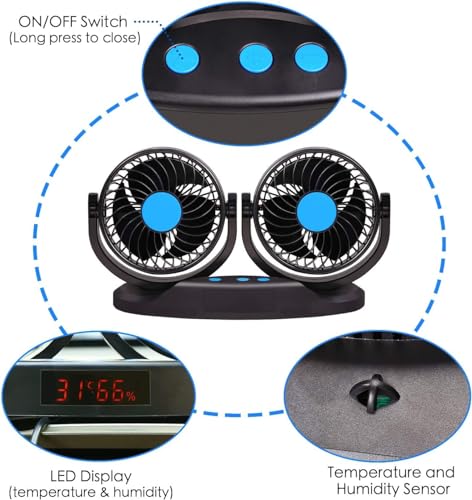 Car Fan, 12V Dual Head Fan, 12 Speeds & 360° Rotatable, 5″ Multi-Functional with LED Display Temperature & Humidity in Car Fan, Cooling Fan for Car Truck Van SUV RV Boat Auto Golf Carts