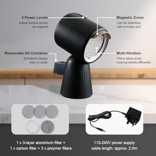- Scope of Delivery: Includes versatile desktop black cooker hood, 3 x polymer filters, 1 x washable aluminium filter, 1 x carbon filter, 2.0 m length cable. Product size: 17 x 23.5 x 35.8 cm (W x D x H)