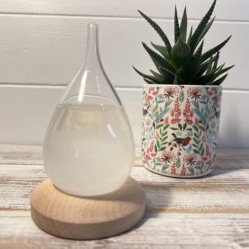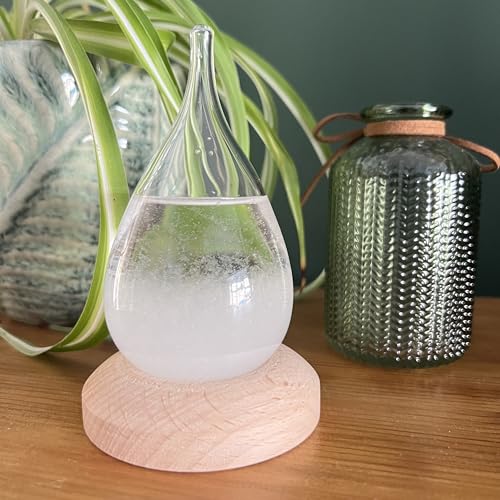 - The tear-drop shape of the Storm Glass, coupled with its wooden base, elevates it to the status of a stunning decorative centrepiece. Designed to captivate the room, its elegant silhouette commands attention, drawing the eye with its minimalist yet striking design. Whether adorning a coffee table, mantelpiece, or shelf, it infuses any space with a touch of sophistication and intrigue.