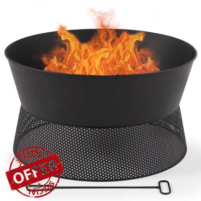 VonHaus Fire Pit – Firepit for Outdoor, Garden, Patio – Portable & Lightweight with Mesh Detail, Black Steel, Fire Poker Included – Use Wood or Charcoal to Fuel