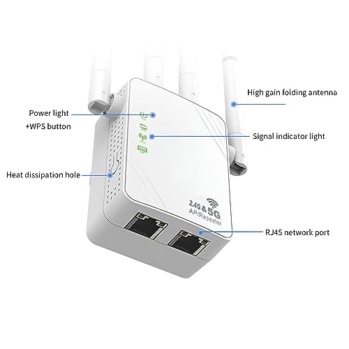 - 【Strong and High Speed WiFi Speed】The WiFi signal repeater extender supports 2.4 GHz up to 300 Mbps, 5 Ghz up to 867 Mbps, the total speed is about 1200 Mbps, with 4 * 3dBi high gain antenna, reducing wireless interference, allowing you to enjoy high definition videos and games and high speed Internet access.