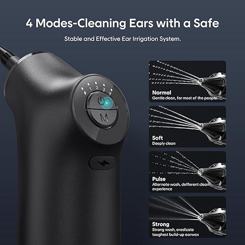 - 【ADJUSTABLE WATER FLOW PRESSURE SETTING】- The ear cleaner has 4 cleaning modes (soft, normal, pulse, strong), you can find the pressure that suits you best and which can meet the different needs of your family. We recommend a water temperature around 37 degrees Celsius for optimal comfort and effective ear cleaning.