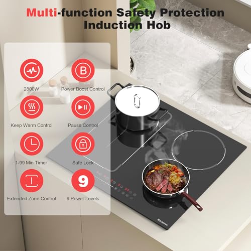 - 【Special Extended Zone】220V induction hob 76cm has a central highlight is the innovative expansion zone design.This induction hob cleverly offers two modes of use: it can be used as 2 separate burners. Or touch the "Extended Zone" button and the 2 burners seamlessly merge into a 39.25*21cm rectangular cooking area, Power boost to 2800W.You can use different sized cookware to cook variety dishes, increasing cooking efficiency and versatility.