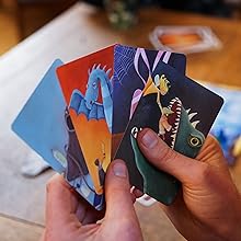 - All other players then also choose a card from their hand that best fits this clue. The Storyteller's card is shuffled with the players' cards, then all the chosen cards are revealed.
