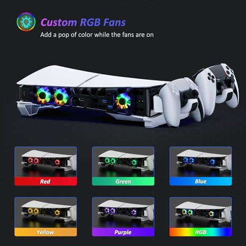 - 【Easy and Fast Installation】To connect the PS5 Slim console with the charging station, use the provided screw. Insert the RGB cooling fan and horizontal stand into the PS5 Slim console. A USB cable is integrated into the charging dock of the PS5 Slim console for PS5 controller charging. Installation is quick and hassle-free.