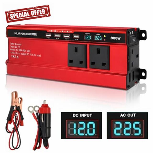 - 12V to 220V Inverter: The pure sine wave inverter converts 12V DC to AC 220V household power, peak power 2000W, which includes 3 AC sockets, 4 USB ports, and 2 convenient crocodile clip cables for quick connect.