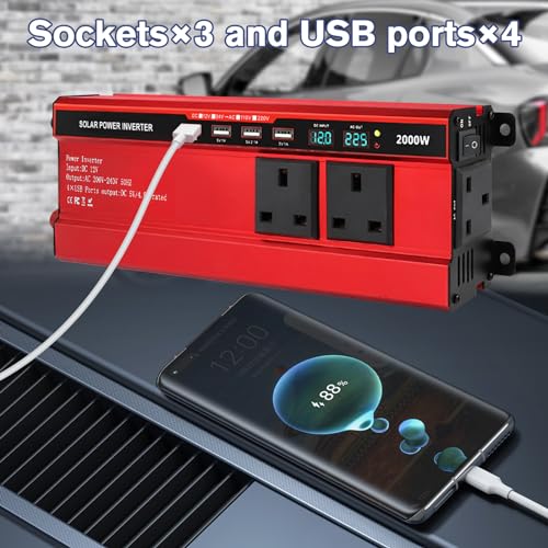 - Quick Use: Included connection cable to connect the converter to the cars and batteries, you can start using the appliances quickly and efficiently. 3 UK sockets and 4 USB charging ports are perfect for powering multiple devices at the same time, the best choice for outdoor activities or travel.