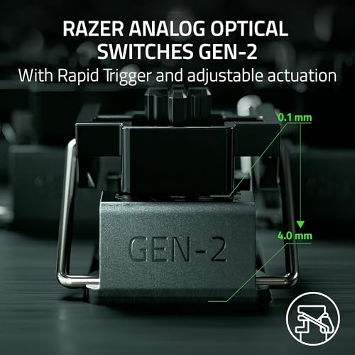 - Razer Analog Optical Switches Gen-2 with Rapid Trigger and adjustable actuation: Max out on precision and response with most advanced switches, featuring Rapid Trigger for ultra-fast repeated inputs, a 0.1–4.0 mm adjustable actuation range, and a 100-million keystroke lifespan